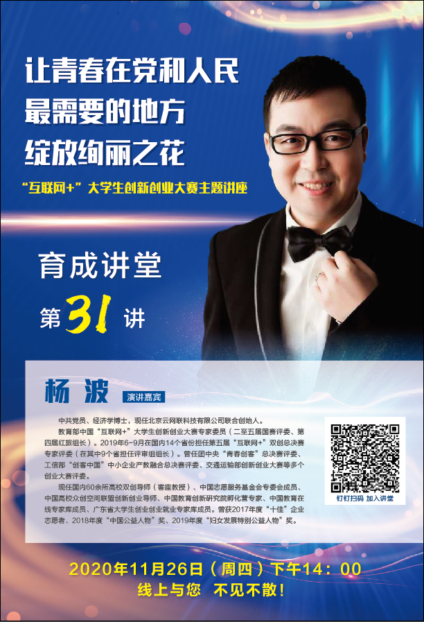 11月26日,由创业学院主办、文法学院承办的“育成讲堂”第31讲以钉钉直播的形式如期开展。教育部中国“互联网+”大学生创新创业大赛专家委员杨波老师应邀作题为《让青春在党和人民最需要的地方绽放绚丽光彩》的主题讲座。我校900余名师生通过扫码直播参与了本次活动。讲座由创业学院陈致远副院长主持。