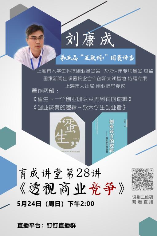 5月24日下午,上海市大学生科技创业基金会、天使伙伴专项基金总监刘康成应邀作客育成讲堂第28讲,为近千名师生作题为“透视商业竞争”的云讲座。此次云讲座由创业学院主办、商学院承办,创业学院副院长陈致远主持讲座。