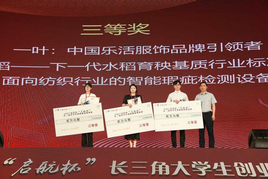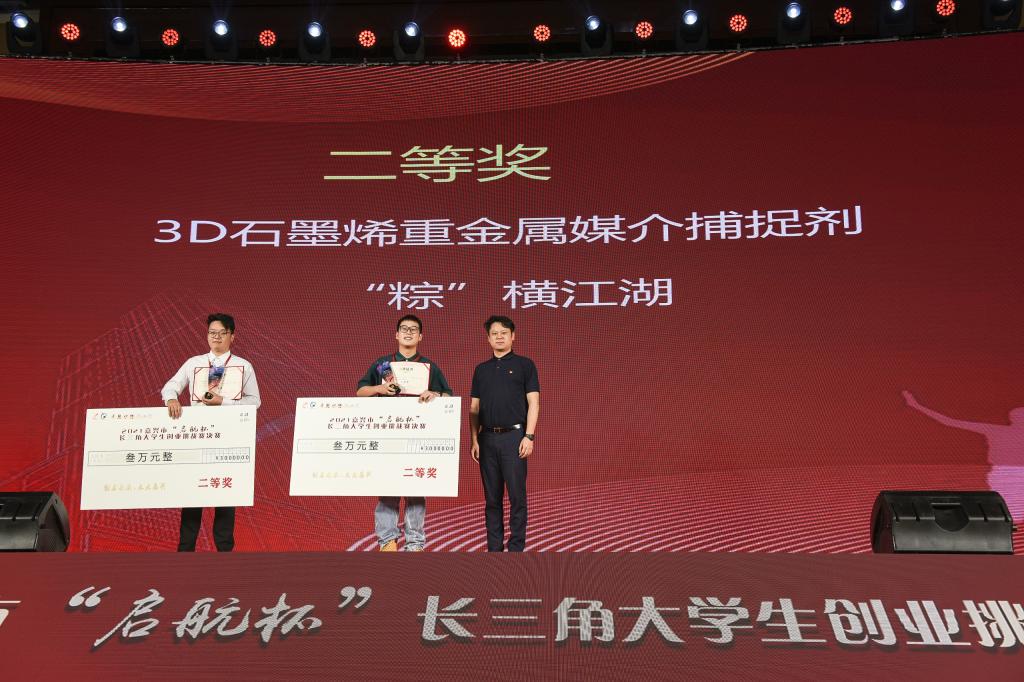 我校入围总决赛的4个项目,荣获二等奖2项,三等奖2项。其中《3D石墨烯重金属媒介捕捉剂》、《“粽”横江湖》总成绩第2名和第3名,荣获二等奖;《若土有稻——下一代水稻育秧基质行业标准引领者》、《一叶:中国乐活服饰品牌引领者》总成绩第4名第5名,荣获三等奖。