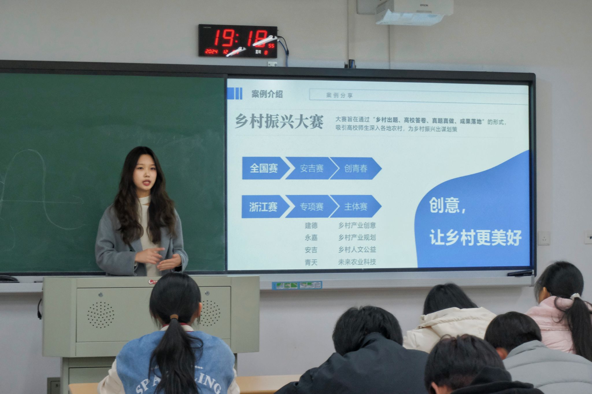 随后,她向学弟学们分享了她在本次乡村振兴项目中的实践经验。她告诉学弟学妹们,想要在竞赛中脱颖而出,调整好心态、找到合适的队友、选定恰当的题材以及寻得良师指导,这四个要素相辅相成,缺一不可,为学弟学妹们指明了竞赛成功的方向。