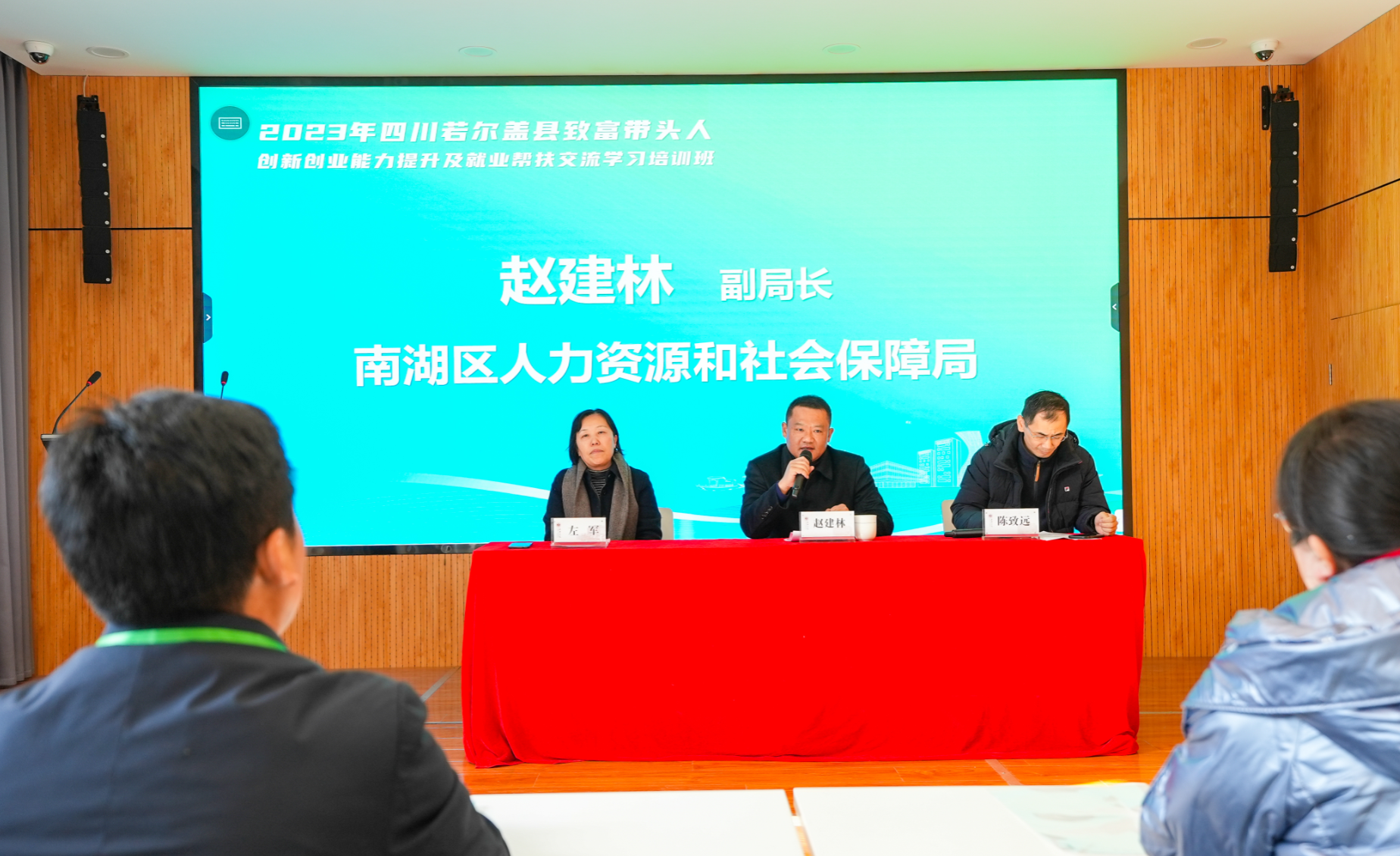 南湖区人社局赵建林副局长在致辞中,首先回顾了自2018年若尔盖和南湖正式结对以来,两地相继开展了全方位、宽领域、深层次的合作。他表示本次培训,既是深化东西部劳务协作、加强就业促进工作的重要举措,也是加快两地共同提升乡村振兴帮扶效能、促进共同富裕的有效路径。