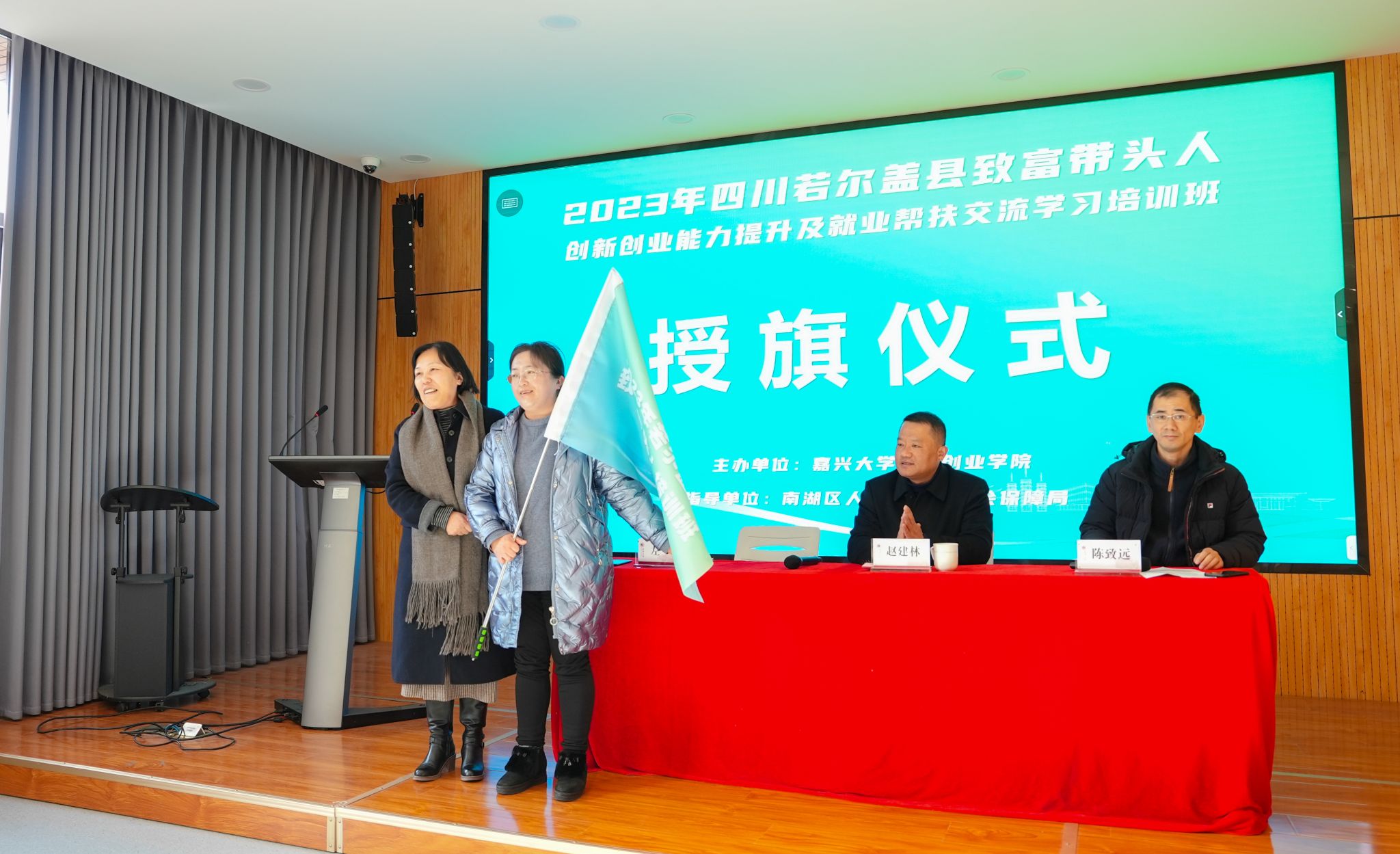 在随后的活动中,左军院长代表我院向学员代表若尔盖县就业局副局长任晓丽授予班旗,并希望大家在南湖期间,能够认真学习、积极思索、加强交流,做到学有所悟、学有所获,努力提升自身的素质能力和专业化水平,为两地东西部劳务协作和就业促进工作做出积极贡献。