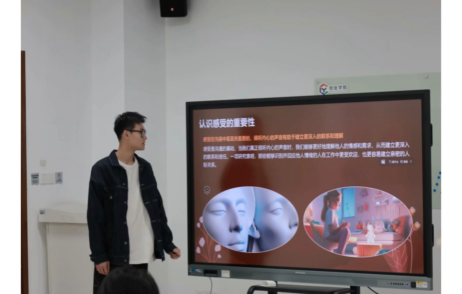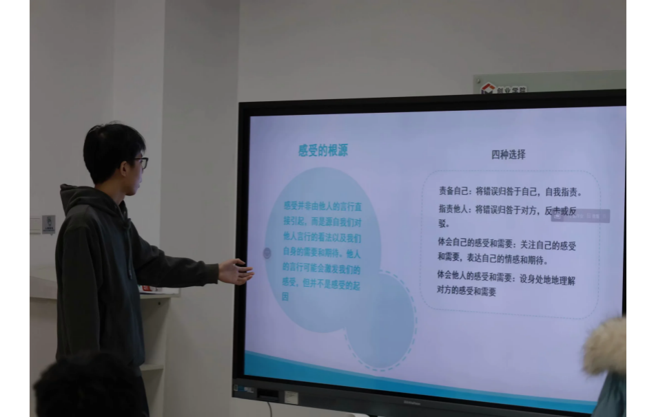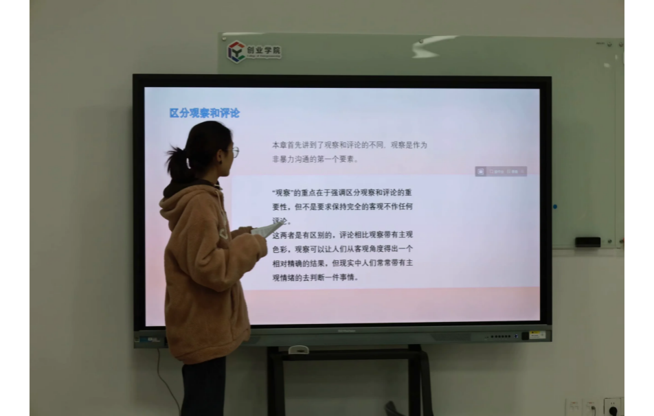 活动成员主要从“冷静地观察”、“全面地思考”、“理性地对话”三个角度进行分享,具体讲解了非暴力沟通在实际生活运用的方法。同时,成员们还结合自身实际,分享采用非暴力沟通来提升个人的沟通能力的体验,并通过“做中学”在创新创业项目中如何来增强团队协作度。
