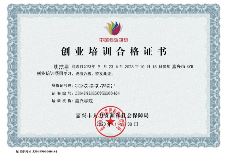 (一)综合成绩合格者,可获得嘉兴市人力资源和社会保障局颁发的创业培训证书,如下示图。