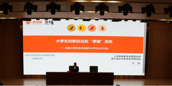 2023年3月23日下午,由文法学院承办的育成讲堂第四十一讲——《大学生创新创业的“幸福”底色》在图书馆一楼报告厅顺利举行。人本家庭教育首席陪伴师、浙江省白水教育科学研究院院长、嘉兴学院99届杰出校友方泉担任本次的主讲人,全校约200名师生参加了此次讲座。
