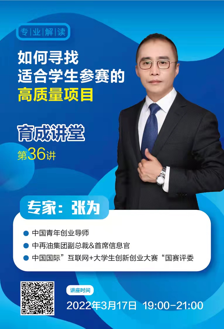 3月18日晚,中国青年创业导师,中再油集团副总裁兼首席信息官,中国国际“互联网+”大学生创新创业大赛国赛评委张为,应邀作客育成讲堂第36讲,为500名师生作题为“如何寻找适合学生参赛的好项目”的云讲座。此次云讲座由创业学院主办、生化学院承办。