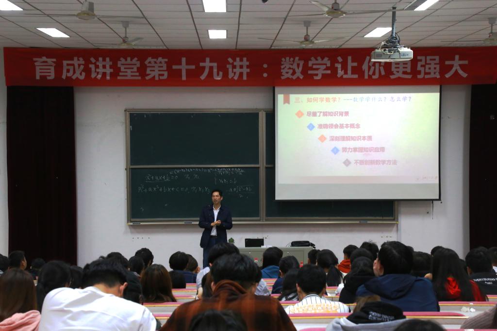 卢兴江教授首先向在座的各位同学介绍了数学从古至今的特殊地位,引用了各个时期的名言警句。卢教授向在座的同学解释了为什么要学数学:一、人的基本素质—数学是具备公民资格的前提;二、促进人的发展—数学培养人的优良品质。卢教授以幽默的语言和自己的经验从五个方面向同学们介绍了该如何学数学:一、尽量了解知识背景;二、准确领会基本概念;三、深刻理解知识本质;四、努力掌握知识应用;五、不断创新数学方法。
